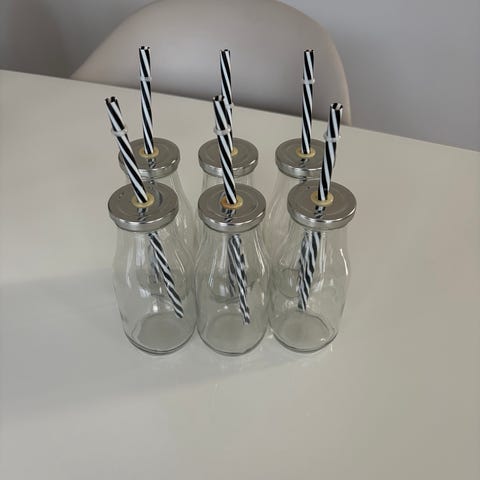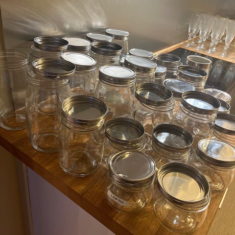 glasburkar och flaskor med lock för köksförvaring. Blandade storlekar och modeller, inklusive glasburkar med bygel- eller skruvlock samt glasflaskor med kapsyl. Lämpliga för förvaring av torra varor, inläggningar, saft eller andra livsmedel i kök och skafferi.
