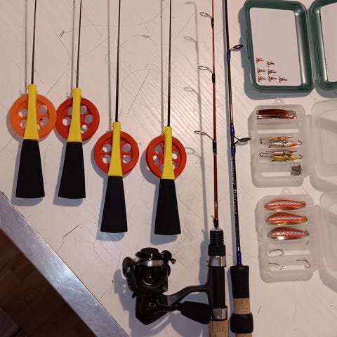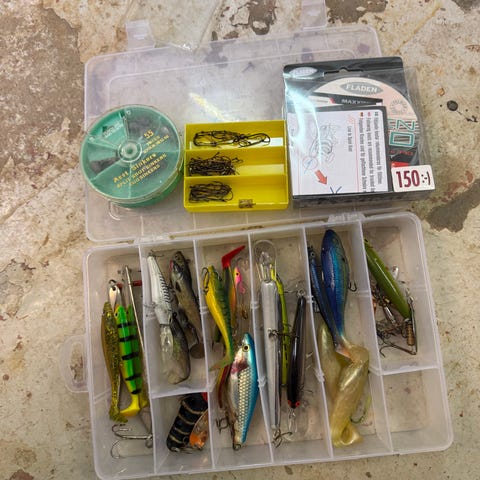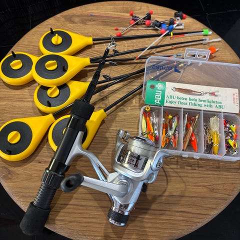 Fiskeset med blandade tillbehör. Innehåller bland annat fiskespö med rulle, flera lösa rullar, beten, mjukbeten, krokar i ask, sänken, pinglor, linor och övriga smådelar för fiske. Passar för olika typer av fiske där flera komponenter kan kombineras efter behov.