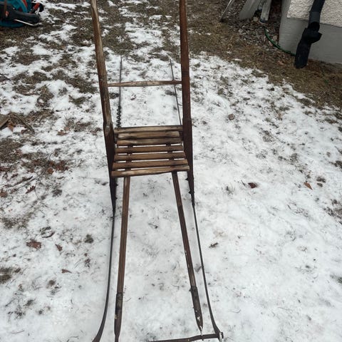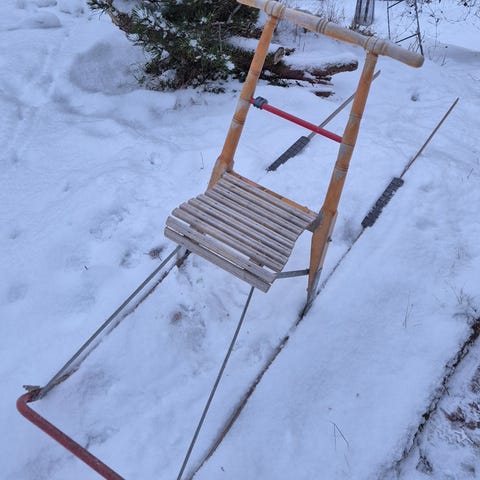 Spark med röd metallram och sits i trä. Utrustad med två medar och handtag