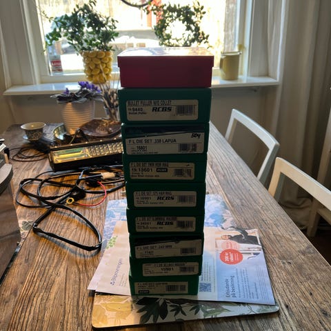 Kollar intresset på mina saker som just nu inte används. Det finns två st kompletta lyman jr pressar samt flera verktygssatser 32sw, 357/38 , 40spl , 45acp , och ett helt nytt kit för 45/70. Dubbelt av 357/38. Sedan lådor med reservdelar och tillbehör. Pris ide 3000kr för allt Lyman. Jo pressar behöver kärlek men fullt fungerande och verktygen är fina på insidan. Dillon swag verktyg 500kr . Rcbs hylssvarv med massa styrdon och klämbrickor enligt bilder. Fullt fungerande 3000kr . Först till kvarn och behöver heller inga brevvänner. Är man intresserad köper man . Ring för ev frågor på noll sju sex 2181854
