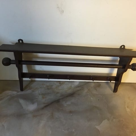 Liten hylla i mörkbetsat trä i antik stil. Gediget trä men vet ej träslag. Finns tre snidade knoppar att hänga saker på.