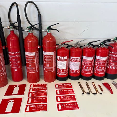 Säljer ett komplett paket med 8 stycken nödutgångs- / utrymningsskyltar i mycket gott skick. Skyltarna har tydliga piktogram med springande person och pil enligt gällande standard.