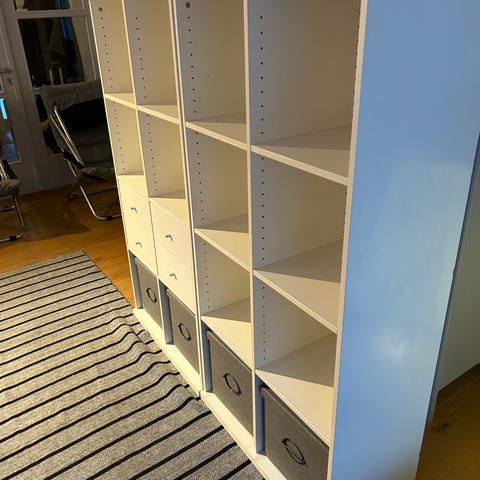 Jättefin barnbyrå med grå canvas lådor och vit trästomme.