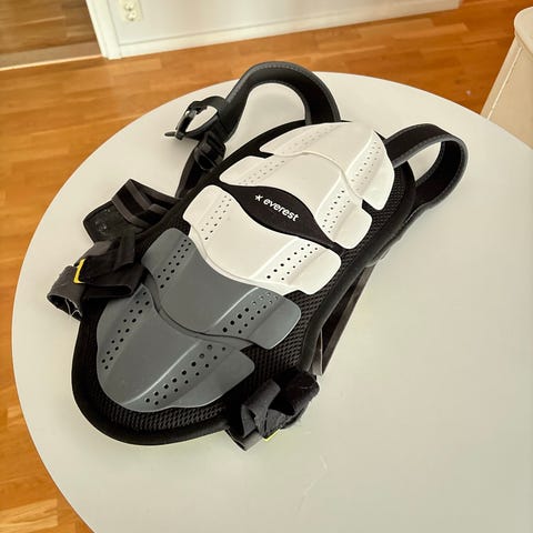 Everest ryggskydd för barn i storlek XXS. Ryggskyddet har hårda skyddsplattor i flera sektioner på utsidan och vadderad insida i svart och gult tyg. Justerbara remmar gör att skyddet kan anpassas efter kroppen.