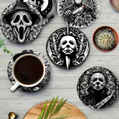 Set med 6 träunderlägg med olika motiv av vargar. Underläggen är runda. 10 cm.