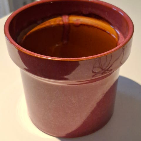 Kruka i terrakotta med glaserad yta. Rund modell med klassisk form och handmålad, dekorativ mönstring i vitt och svart på rödbrun botten. Passar för inomhusbruk till mindre växter eller som dekorationsföremål på hylla, fönsterbräda eller bord.