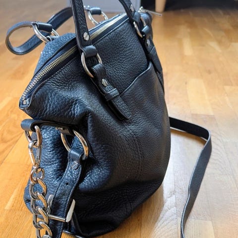 Hugo Boss handväska för kvinna i svart läder. Väskan har dubbel handtag upptill samt avtagbar kedjedetalj på sidan. Utsidan är i kraftigt, kornigt läder med metallfötter undertill för extra skydd. Väskan stängs med dragkedja upptill. Invändigt finns textilfoder med en större huvudficka, en innerficka med dragkedja samt öppna fack för mindre saker. Passar för vardagsbruk och till att bära personliga tillhörigheter som plånbok, mobil och nycklar.