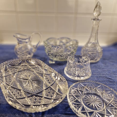 Tre stycken slipade glasflaskor med slipade proppar stående på fat av nysilver. Användes tex för kryddor eller olja/vinäger för att ha stående på matbordet.