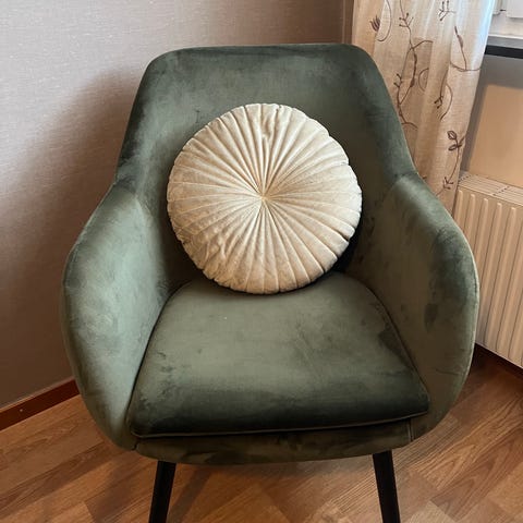 En fin fåtölj i sammet från Mio som knappt är använd. Mest stått i ett hörn då det känts dumt att kasta en så fin möbel . Gör om i mitt rum och i hemmet så den passar inte längre in med vår inredning hemma. Finns en dragkedja på baksidan. Kudden ingår.