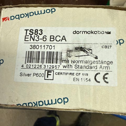 Dormakaba TS83 dörrstängare EN3-6 BCA. Dörrstängaren levereras i originalkartong med arm och monteringsdetaljer enligt bilder. Modellen är avsedd för överliggande montering och har justerbar stängningskraft i klass EN3–6. Passar för inner- och ytterdörrar inom angivet kraftområde, exempelvis i bostäder, kontor eller liknande miljöer där kontrollerad dörrstängning önskas.