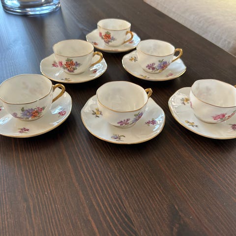 Vackra kaffekoppar med blom- och gulddekor.