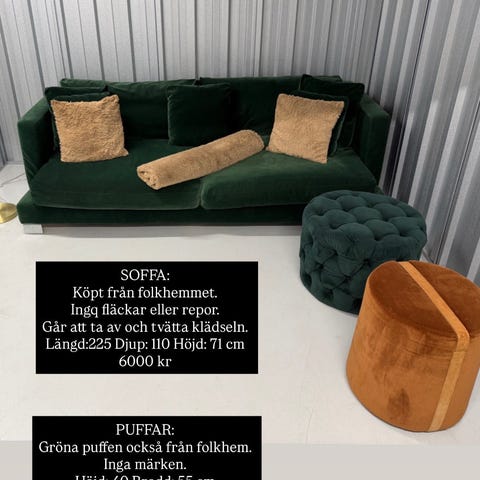 soffa 3 .2 och ett sitt plater tv bord plus ett bord . Ljus brun färg fins ett par te fläck går få bort de om man tvättar . Annars är allt e hel inget trasig . För mer info skriv eller ring med vänlig hälsning 🙂