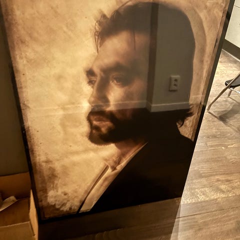 Väggkonst i form av flera tavlor med ansiktsmotiv i bruna och gula toner. Motiven föreställer stiliserade ansikten i närbild, tryckta eller målade på ett tyg- eller dukliknande material. Varje del har eget motiv och kan hängas separat eller tillsammans som en serie. Passar som dekoration i exempelvis vardagsrum, hall eller kontor. Märke och exakta mått är okända.