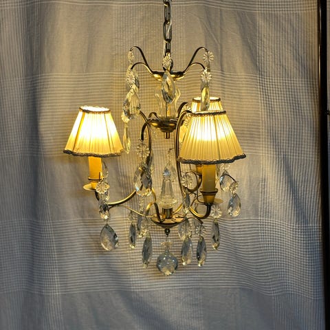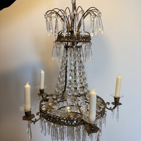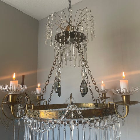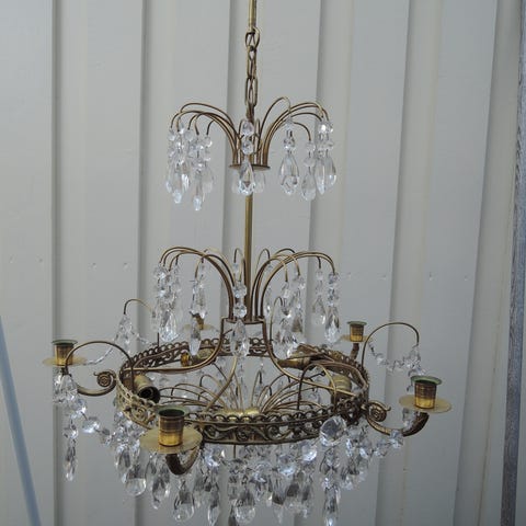 Höjd med kedjan 145 cm. Går självklart att korta . Höjd kristallkronan 68 cm. Diameter 55 cm.