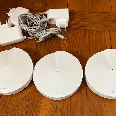 TP-Link Deco M4 mesh-system i vit färg. Systemet består av tre enheter utformade för att ge trådlös nätverkstäckning i hem eller kontor. Varje enhet är cylindrisk med vit utsida och mörk ovansida med ventilationsöppningar. Mesh-systemet är avsett för att förbättra wifi-täckning genom att flera noder samarbetar till ett gemensamt nätverk. Passar för användning med datorer, mobiltelefoner, surfplattor, smart-tv och andra nätverksanslutna enheter i hushållet.