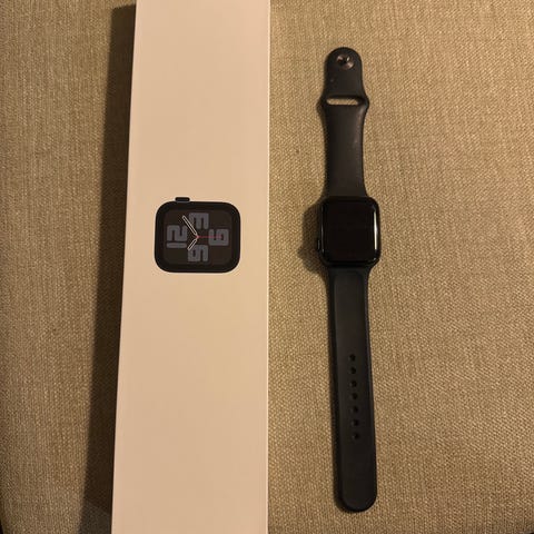 Apple Watch smartklocka i svart färg med svart armband. Rektangulär skärm och justerbart armband med flera hål för passform. Lämplig för vardagsanvändning, notifieringar och aktivitetsmätning. Levereras på originalkartong enligt bild. I nyskick.