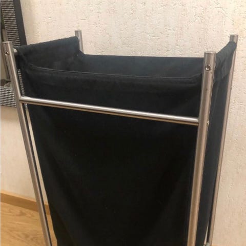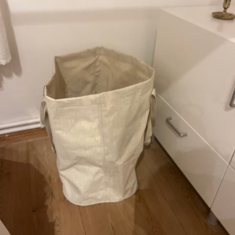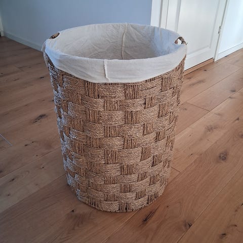Tvättkorg i grå textil med text och handtag, 40cm i diameter, 54 cm hög. I bra skick, sparsamt använd.