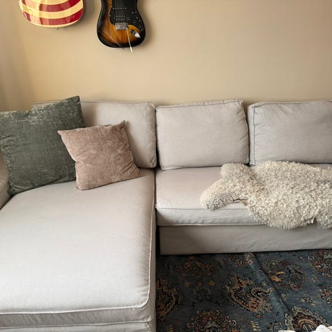 En skön soffa, i grått tyg, som tyvärr inte kommer få plats dit jag ska flytta.