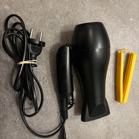 Modellen är ca 30x30cm stor, har munstycke för riktad luftström och flera knappar på handtaget för att justera värme och luftflöde.