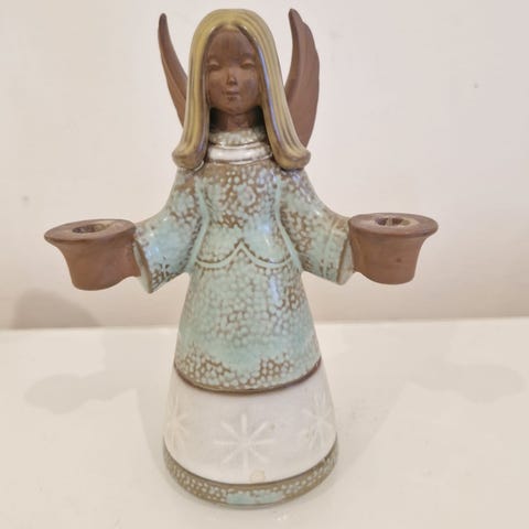 Jag säljer en ljushållare föreställer två små älvor i ljusa pastellfärger med skira vingar, som tillsammans bär en flätad korg där ett värmeljus kan placeras.