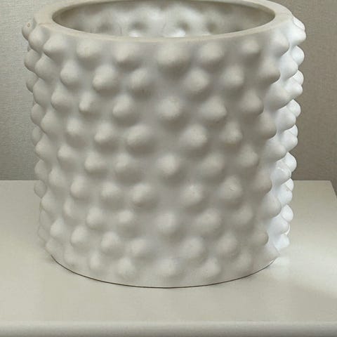 Cult Design fyrkantig kruka i vit keramik med reliefmönster på utsidan. Passar för mindre växter eller som ytterkruka. Krukan har glaserad utsida och oglaserad insida. Mindre slitage och missfärgning kan förekomma invändigt samt en mindre nagg på kanten, se bilder för skick.