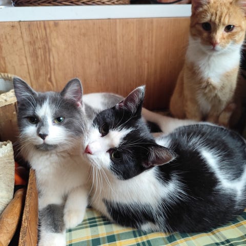 Vi är 3 hanar och 1 hona, vi är mycket sociala och sällskapliga. Vi älskar att busa och leka men vi älskar även att få krypa upp jämte i soffan på en mysig filt och bara få sova. Vi älskar barn då vi ha fått växa upp med barn. Vi är rumsrena och gå på lådan, vi äter både torrfoder och blötmat.