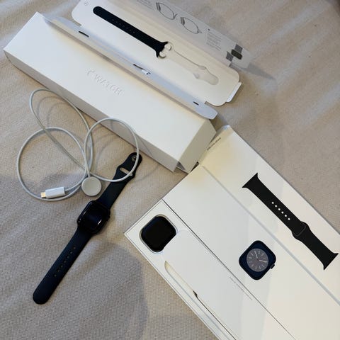 Apple Watch smartklocka i svart färg med svart armband i träningsmaterial. Pekskärm och pulssensor på undersidan av klockan.