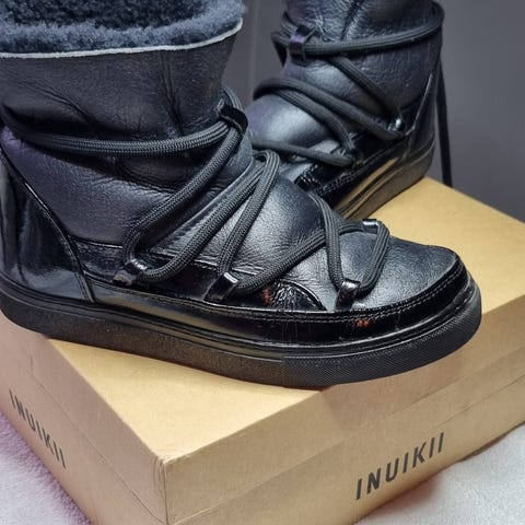 Inuiiki vinterskor i storlek 38. Modellen är fodrad med mjukt, luddigt material invändigt för extra värme. Ovandel i grått material med svarta snörningar som går korsvis över foten och runt skaftet. Mörk sula med dekorativa nitar runt kanten. Passar som varma och stabila skor under kallare väderförhållanden.