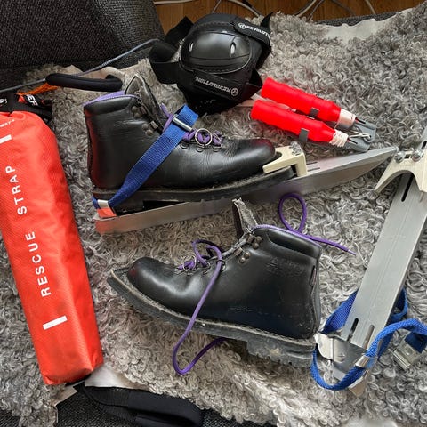 Skridskor: Lundhags 50 cm med ”klick-in-bindning” (kanske den bästa skridskon som Lundhags gjort) stadiga, utan remmar och lätta att ta av och på i toppskick Bra bett (behöver inte slipas i år)