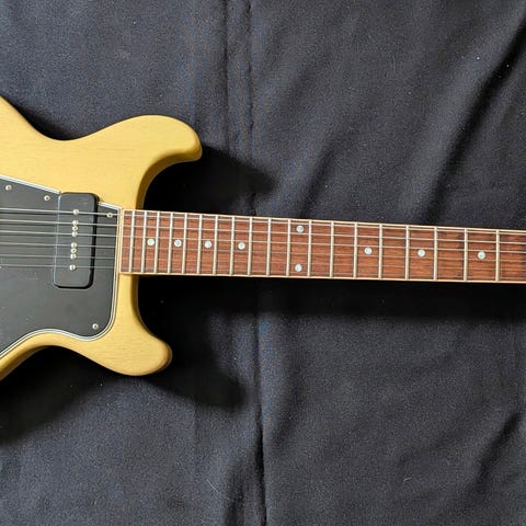 Gitarren har 3-lagers plektrumskydd och bindning runt kropp och hals.