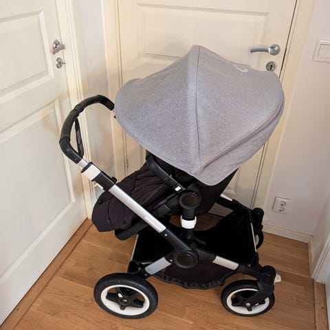 Bugaboo Fox i grått tyg. Vagnen har sittdel med justerbart ryggstöd och fempunktssele, samt liggdel. Avtagbar frontbygel och sufflett som ger skydd mot sol och vind. Förvaringskorg under vagnen för packning. Handtaget är slitet som syns på bild.