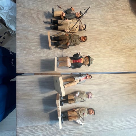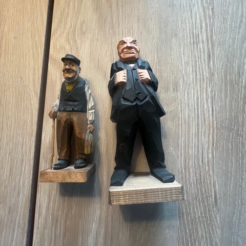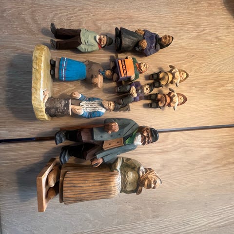 Set med handgjorda träfigurer i snidat trä. Figuren föreställer flera personer i traditionella kläder. Passar som prydnad eller samlarföremål. Varje figur är individuellt utformad med målade detaljer. Material: trä. Flera figurer ingår i samma set enligt bild.