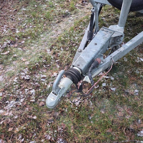 WT Trailer släpvagn med blått kapell. Enaxlad obromsad släpvagn med galvad korg och löstagbar gallergrind och tippfunktion. Utrustad med blå presenning som täcker lastutrymmet samt reflexer och lyktor enligt standard för vägtrafik. Lämplig för transport av exempelvis gods, trädgårdsavfall eller mindre maskiner inom släpvagnens last- och viktbegränsningar.