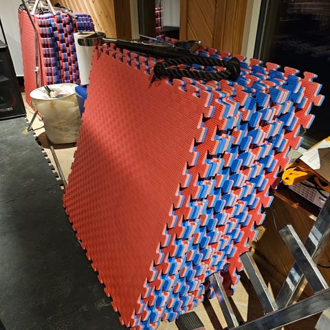 Träningsmatta i form av pusselmatta i röd och svart färg. Består av kvadratiska skumplattor som hakas i varandra med pusselkanter. Ytan är räfflad för bättre grepp och dämpar stötar mot golvet. Passar för hemmagym, kampsport, lekytor eller annan inomhusträning där ett mjukare och skyddande underlag önskas.