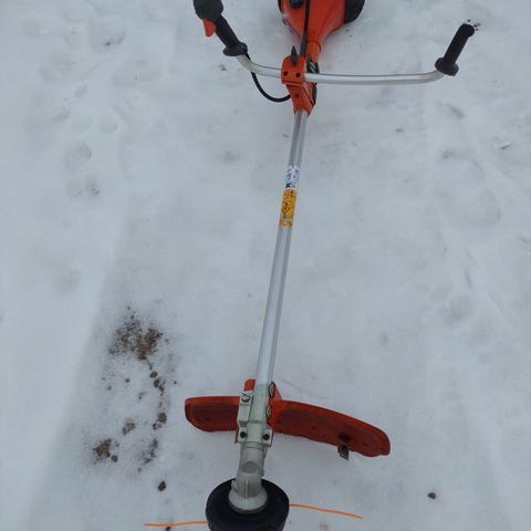 Röjsåg med dubbelhandtag och selefästen. Maskinen har styre med två handtag för bättre kontroll vid röjning och grästrimning. Passar för arbete i trädgård, runt tomt och i lättare skogsröjning beroende på monterat skärverktyg. Drivkälla, effekt och övriga tekniska specifikationer framgår inte av bilden.