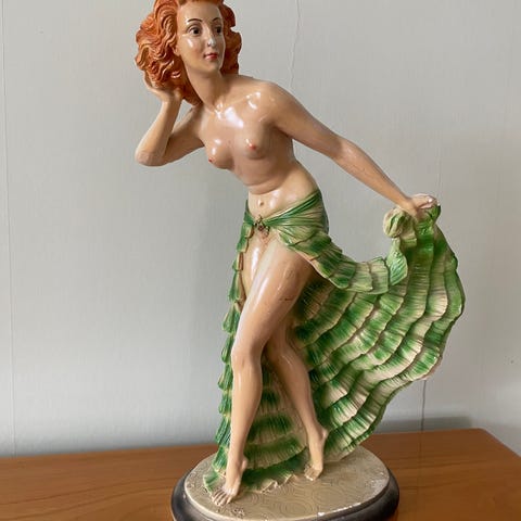 Väldigt vacker staty som föreställer en flicka som håller i ett fågelbad, fågeln står på ett ben, (har bara ett.) Mycket gott skick.