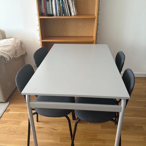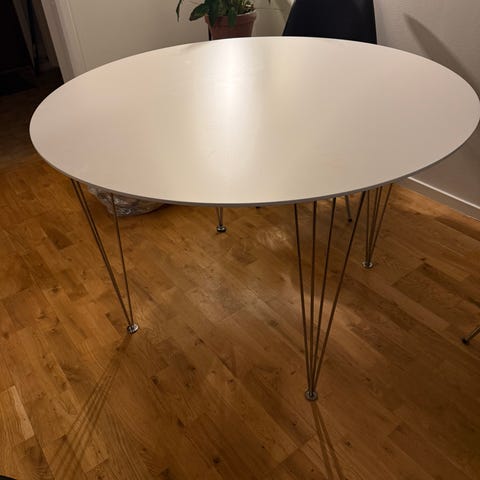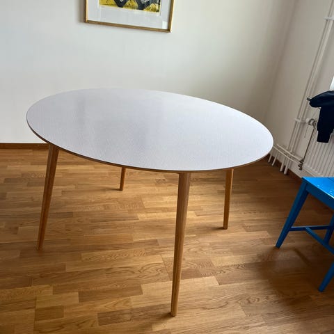 Vitt matbord med svarta ben i använt skick, är lite avskavd på ena sidan på bordsskivan.