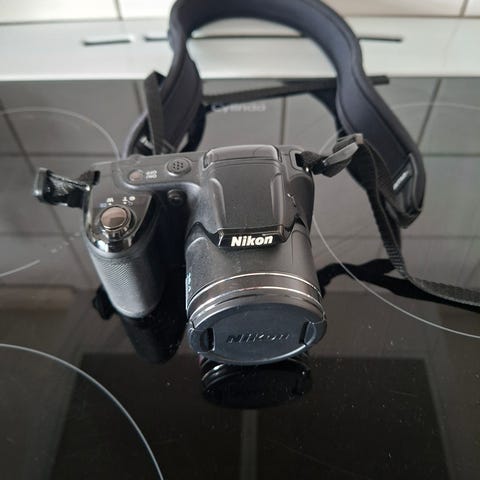Nikon Coolpix L310 digitalkamera i svart utförande. Kompaktkamera med fast zoomobjektiv och inbyggd blixt. Kameran har skärm på baksidan för bildvisning och menyhantering samt handledsrem för säkrare grepp.