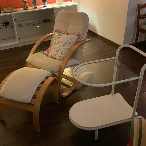 Krypa-upp-i-fåtölj. Klädsel slitstarkt kretongtyg. Bra skick.