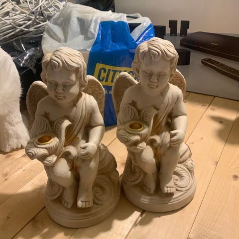 Jag har en stor dekorationsfigur i form av en änglar med vita och guldfärgade detaljer. Figuren är gjord för att användas som inredningsdetalj i hemmet. Stora och fina. Finns möjlighet att skicka vid intresse men då står köparen för frakt.