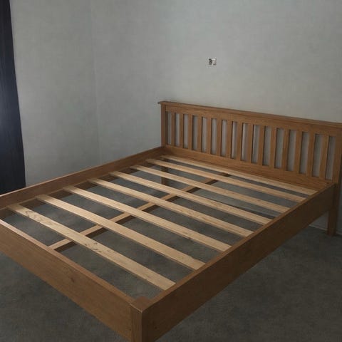&Tradition säng med ribbgavel i trä. Sängen har en ram i ljust trä med hög huvudgavel med stående ribbor. På sängen ligger en madrass med randigt överdrag från Lagans of Scandinavia. Passar som vanlig säng i sovrum eller gästrum. Exakta mått och material för ram och madrass är inte angivna.