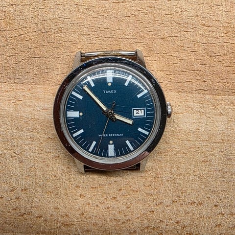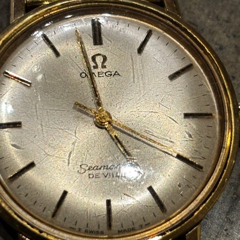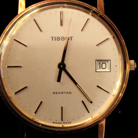 Glas har små repor, boetten visar bruksspår, guldpläderingen är kvar, liten skroma på undersidan som inte är synlig, band är eftermarknad och i fint skick, 18mm.