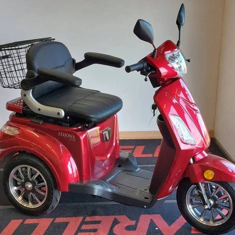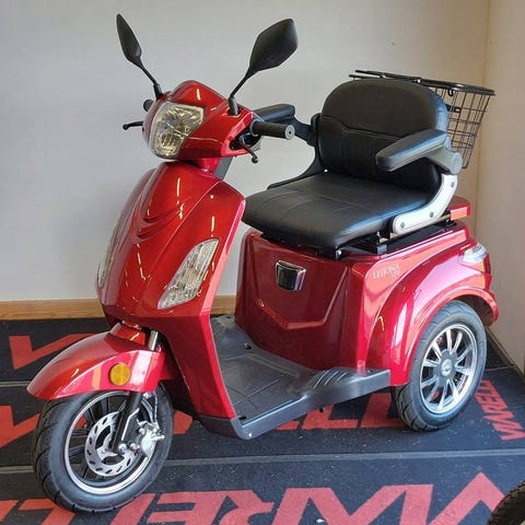 Trehjulig Eloped i röd färg. Elopeden har tre hjul med aluminiumfälgar, digital display med hastighets- och batteriindikator samt en sits med ryggstöd och armstöd. Bak finns en låsbar förvaringsbox. Karossen har några repor och det finns en skada på förvaringsboxen, se bild, men inget som påverkar funktionen. Batterier från 2024 och Elopeden har inte använts under 2025. Maxfart 15 km/h. Den går att ladda i ett vanligt eluttag. Hämtas i centrala Jönköping. Betalas med swish.