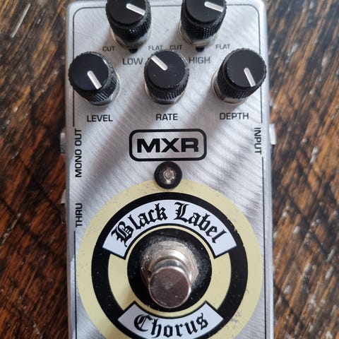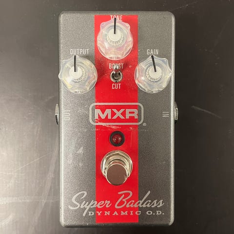 MXR Super Badass Distortion gitarrpedal. Effektpedal för elgitarr med flera reglage för att justera distorsionsnivå, ton och volym. Pedalen är utformad för att ge olika distorsionsljud och kan användas i olika musikstilar.