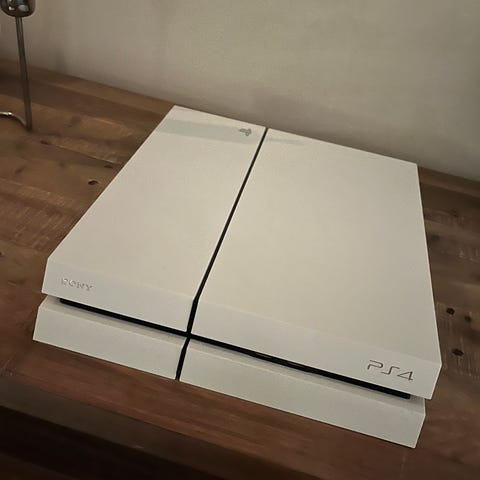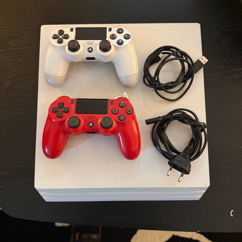 Sony Playstation 4 Pro 1TB spelkonsol i vit färg. Stationär konsol avsedd för tv-spel med stöd för fysiska spel på skiva. En vit handkontroll (DualShock 4) syns på bilden tillsammans med flera spel i fodral. Konsolen är lämplig för användning i hemmet och ansluts till tv eller bildskärm via HDMI och till nätverk via wifi eller nätverkskabel.