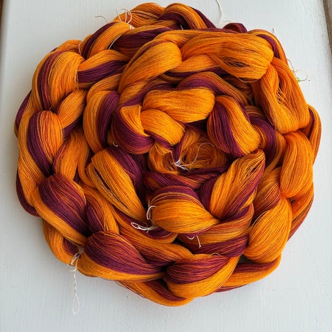 Varpfläta i snarlika gula färger, nyss varpad av mig med 4 trådar och två skäl, sedan vikt dubbel och ihopsatt så du lätt ser hur jag tänkt.