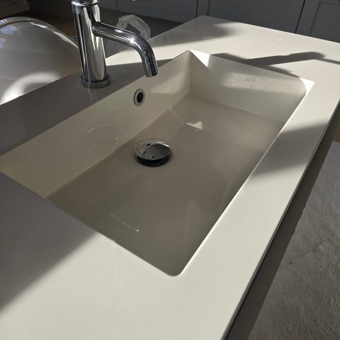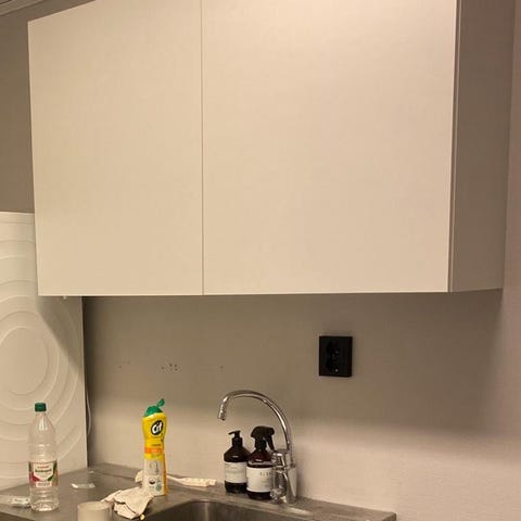 Badrumsskåp med blandare och handfat 90 cm brett och högskåp.