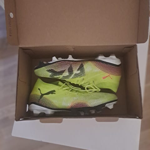 Säljer ett par Puma fotbollsskor med dobbar i färgen vit med rosa undersida. storlek 41. Skorna är i okej skick. Perfekta för användning utomhus.