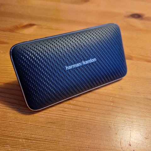 Harman Kardon bärbar högtalare i kompakt kvadratisk design. Högtalaren har svart frontgaller och svart läderbaksida med ljus ram runt kanterna. Ovanpå finns knappar för styrning av ljud och funktioner. Passar för trådlös eller portabel uppspelning av ljud från exempelvis mobil, surfplatta eller dator, hemma eller på resa.