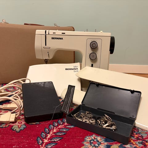 Bernina 830 Record symaskin i vit färg. Mekanisk modell med flera olika sömmar, inklusive raksöm och olika dekor- och sicksacksömmar, vilket framgår av provlappen på maskinen. Maskinen har reglage för stygnlängd och stygnbredd på framsidan samt handhjul på sidan. Till symaskinen hör fotpedal, strömkabel och tillbehörslåda med olika pressarfötter och smådelar. Lämplig för allmän sömnad och olika typer av tygprojekt i hemmet.ny servad fungerar klockrent med alla tillbehör och komplett